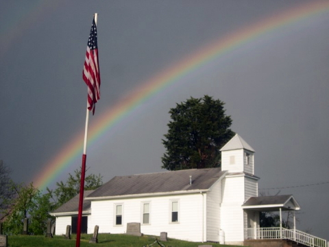 With stormy skies and thunderheads sweeping across the Village of Hur, the sun brightened one day to produce a rainbow above the Hur Church (Photo by Holly Rose)