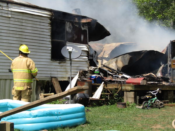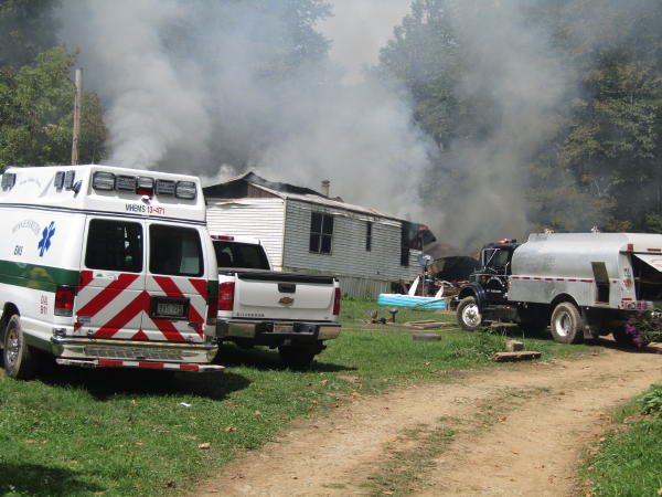 Calhoun's three fire departments responded to a structure fire on Honeysuckle Lane (Simmons Hollow) off Sinking Springs Road just after 1 p.m. Wednesday. Fire consumed two adjoining mobile homes at the head of the primitive road hollow. A female at the residence received burns to her hand and arm, she and a small child were taken to Roane General Hospital. Sources at the scene identified the occupants as Michael and Amber Neal, the property owned by Donald Simmons. The Grantsville, Arnoldsburg and Upper West Fork VFDs responded.