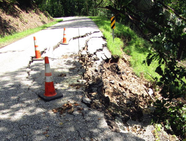 A slip on Barnes Run Road has worsened daily since last weeks intensive flooding, making traffic one lane, creating a hazard on the high hillside road.
