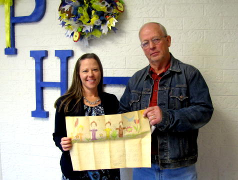 ![]() Clarke Wilson made a special presentation to Mrs. Amy Nicholas, principal of Pleasant Hill Elementary, during the school's Veterans Day celebration on November 9. Mr. Wilson was stationed in Germany in 1991 during the Gulf War and received a letter from Tara Jacobs, sister of Mrs. Nicholas. He said he taped the letter to his barrack room wall and has kept it all these years. Mrs. Nicholas will share this letter with students each year during the Veterans Day celebration to show how a small gesture of kindness can mean so much to someone. |