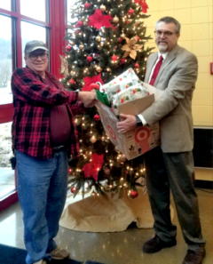 With many families needing some extra help we are blessed to have so many people willing to help out. The AES staff says, "Thank you to each and every person that helped in any way. Merry Christmas and Happy New Year!" Larry Pritt (left) with the Good Sams RV Club, donates a box of gifts for a student to Charles Thomas, Principal at AES.