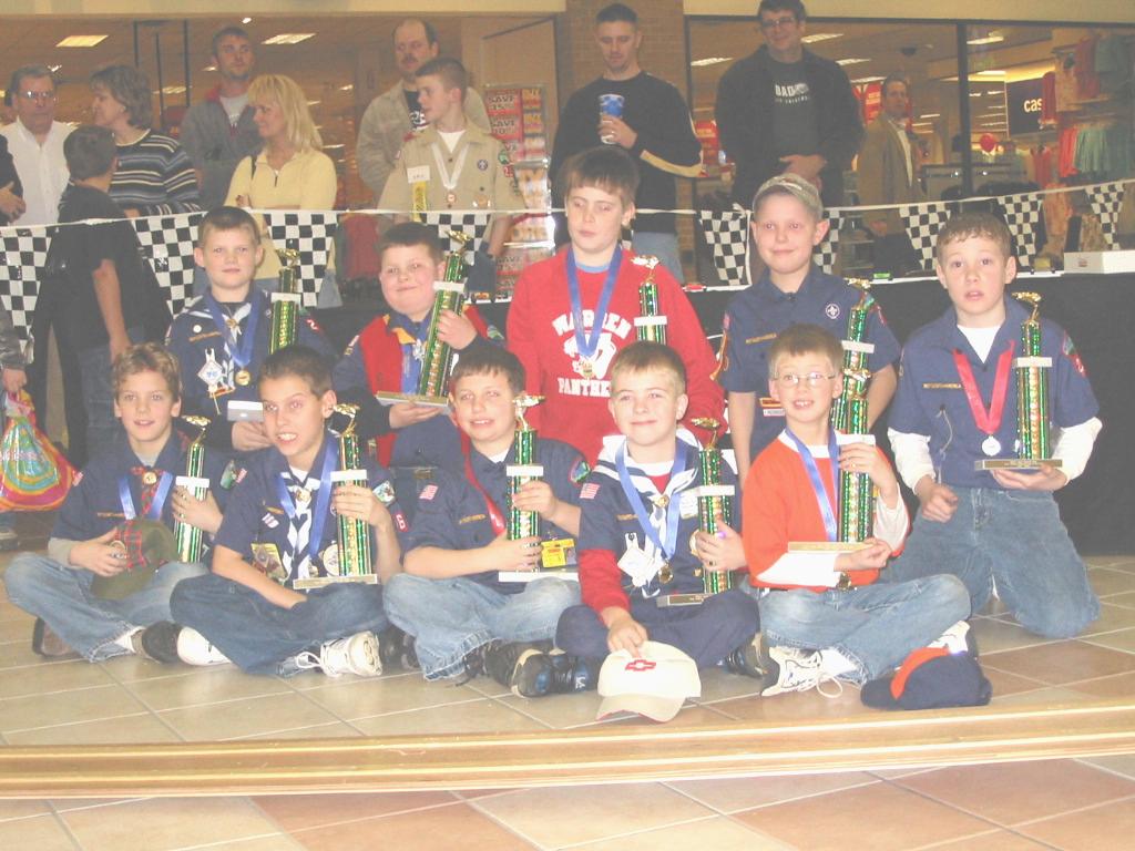 Row 1 (on floor) Boles, Skidmore, Eickert; Bryant; Wigal The Allohak Council of the Boys Scouts of America held their 30th Annual Davis Anderson Memorial Pinewood Derby on Saturday, February 1,2003, hosted by the Grand Central Mall. 500 Cub Scouts and their families participated in this year's event. Over 100 volunteers helped in the preplanning of this double elimination event and on race day. Registration began at 9 a.m. and the first races of the day started at 10 a.m. and ran continuously all day on 5 separate Derby tracks throughout the Mall. The final 10 racers squared off for the Allohak Council finals at 6 p.m. on Track A by JC Pennys. Winners of this year's event were: 1st PlaceâDustin Harlow from Pack 217 in Marietta. 2nd PlaceâBrandon Magill from Pack 39 in Bridgeport. 3rd PlaceâDaniel Boles from Pack 117 in Washington. 4th Place---Justin Parsons from Pack 91 in Belpre. 5th PlaceâGary Bryant from Pack 231 in Marietta. 6th PlaceâZack Bowes form Pack 211 in Marietta. 7th PlaceâAustin Skidmore from Pack 6 in Parkersburg. 8th PlaceâLucas Wigal from Pack 19 in Belpre. 9th PlaceâTom Dearth from Pack 211 in Marietta. 10th PlaceâMark Eickert from Pack 19 in Belpre. Winners of the mayor's race was Marietta's Joe Matthews, with Bill Macafee from Belpre taking second and Alan Haught from Harrisville taking third. Kathy Anderson of the PWD Committee placed forth. The Pinewood Derby requires racing participants to work with their families and packs to learn the crafts necessary to make the individuals cars, the rules that must be followed in the car making, the racing process and most important sportsmanship. This has to do with how the Scout acts and behaves while participating in the Derby process. This event is not just about winning, but also how to be a good winner and loser and spending quality time with your friends and family and most importantlyâhaving fun! Nationally, each year over one million boys and parents team up to participate in a Pinewood Derby. Working with their families they carve their cars out of standardized kits, decorate the cars, weigh the cars, and adjust the cars and finally race the cars. This partnership of parents and son working on the car has become a symbol of the event success. Locally over 1,000 boys and their families participate in this event each year. The Allohak Council Pinewood Derby Committee sets simple rules for the Derby and each Scout receives a set of these rules with their racing kit. Per Derby rules, all Scouts are required to build and race a new car each year. All Scouts are reminded that they must follow these rules to participate in the Pinewood Derby. Race day each car is numbered, weighed, measured and inspected to confirm that the racing rules have been followed. Dates for the 2004 Pinewood Derby will be on Saturday, February 7, at the Grand Central Mall. Registration deadline will be Jan. 28, 2004.