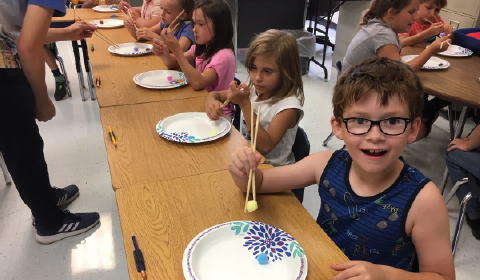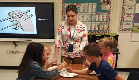 Masa showed the students how to use chopsticks with the Chopstick Challenge. They made Origami cups and even tried wasabi peas. Masa ended his presentation with showing different Japanese dances and sharing their music. Pleasant Hill School students and staff would like to thank student teacher, Miss Stoops, for arranging Masa's visit.