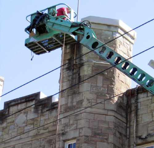 Workers were putting the final touches on the Twin Towers of old Calhoun High School, yesterday, a current effort to preserve the structures