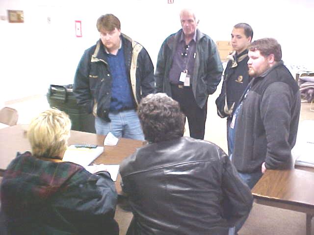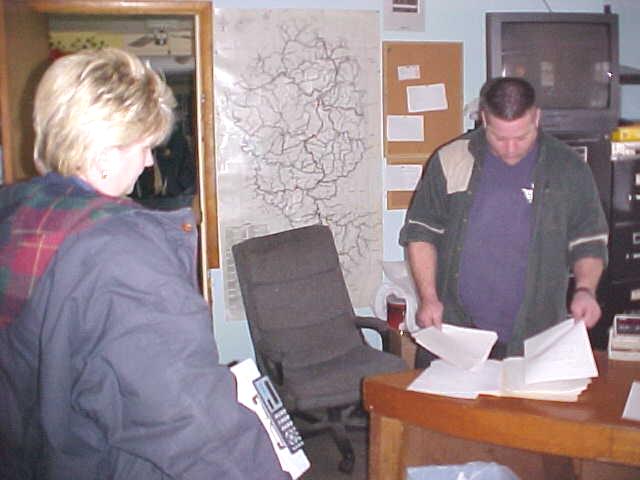 Chief Heath and FEMA worker review "It is essential for county residents to call 354-9271 and report the losses," said Stemple, who is building a case for disaster assistance. "We must have enough damage to quality." he said. Stemple said to give a general description of the damage, name, address and phone number.