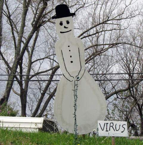 A lawn display on Town Hill, Grantsville, shows a snowman urinat- ting on a "virus," the stream is electrified for late late viewing