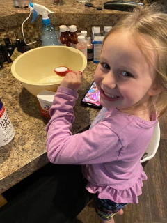 Pleasant Hill Kindergarten and First grade students, pretended to be chefs and helped someone in their home cook or bake something. Cooking is a wonderful activity to do with children! They learn so many skills such as learning to follow directions, math skills like fractions when measuring, practicing reading if they read or write a recipe and of course learning all about temperature with the oven. ![]()