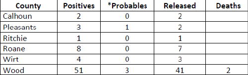 | Parkersburg, WV May 26, 2020 â The Mid-Ohio Valley Health Department (MOVHD) announced a new positive COVID-19 case in Wood County and one new positive case in Pleasants County. Wood County has a total of 51. Pleasants County is now at three positives. Wirt County has four positive cases, and Calhoun County has two cases. Ritchie County continues to have only one case. Roane County has eight cases. Cases are reported to the county of residence. Totals for the counties are: