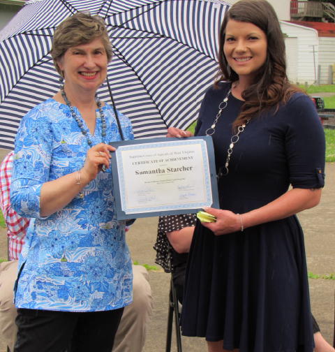 Prosecutor, By Bob Weaver A Calhoun woman, Samantha Starcher, is Calhoun's first graduate of the Roane-Calhoun Adult Drug Court, with a number of officials, family members and guests attending a ceremony Friday at the Arnoldsburg Community Park. Starcher has 18 months being clean and sober, completing multiple hours of community service, active in recovery groups, and helping others.