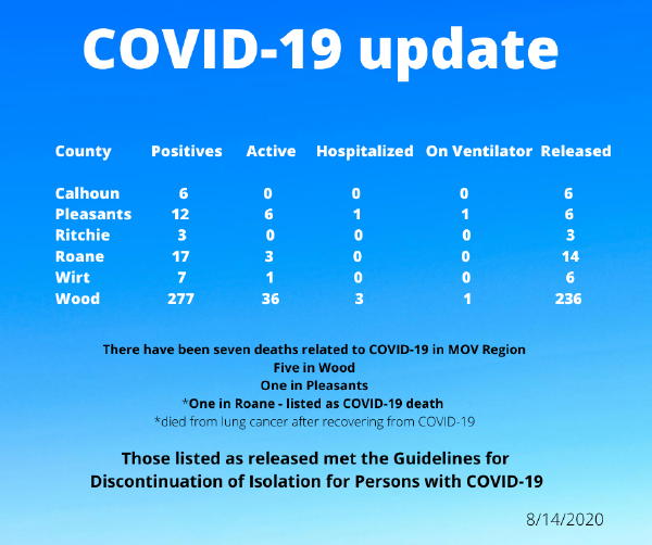 The Mid-Ohio Valley Health Department has released COVID-19 updates for August 14th, 2020.