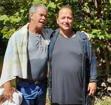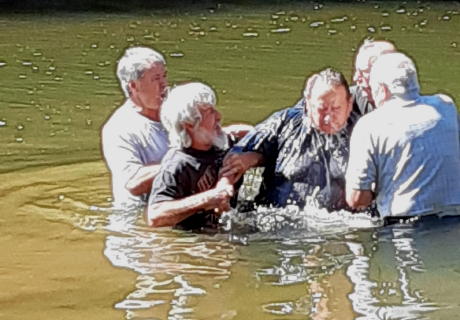 Sam Murphy is being baptized by Pastor Clark Samples helping were Chuck Smith, Gene Little, and Mike Sampson