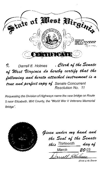 ![]() The new bridge across the Little Kanawha River at Elizabeth has been re-named in honor of the veterans of World War II, according to a special resolution passed by the West Virginia Legislature. |
