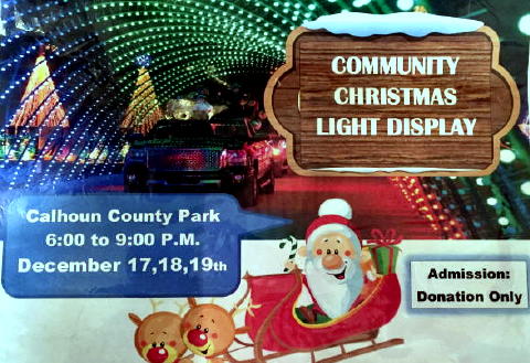 The Light Show at the Calhoun Park continues through Friday and Saturday, December 18-19, 6:00-9:00 each night. Drive-thru displays from Parkâs entrance thru campground with about twenty displays expected. A continuous number of cars came through the first night of the display. Donations will be accepted toward park upkeep and improvements.