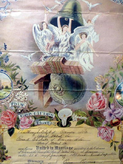 Large framed marriage certificate from 1914 Andrew Lovell "Andy" Edgell (1891-1975) married Rosa Ann Chedester (1897-1980) in 1914, and built an impressive house on Rowels Run (Cremo) about 1920, still standing. Andy Edgell was in World War I and his son Donald Lee Edgell was in the Korean War.