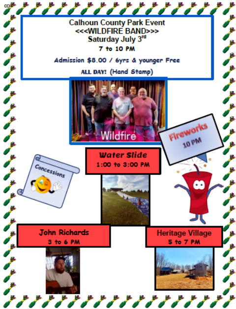 COUNTY PARK WILL HAVE FAMILY FUN FIREWORKS DAY SATURDAY - "Wildfire" Amphitheater Stage, John Richards Performs, Waterslide, Fireworks