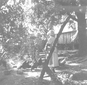 Virginia Riggs McCoy, wife of John Ira McCoy of Hur WV, feeding chickens in 1950's. -