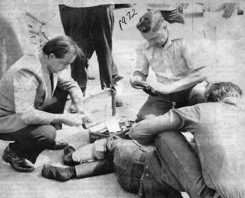 ![]() TIMES RECORD [Spencer, WV] - At scene (shown above) of Tuesdays motorcycle wreck is Bob Weaver of Sinnett-Weaver Funeral Home ambulance service, shown administering first aid to injured leg of motorcycle driver David DeBoard who received multiple compound fractures to lower left leg, later transferred to St. Joseph Hospital by the ambulance service