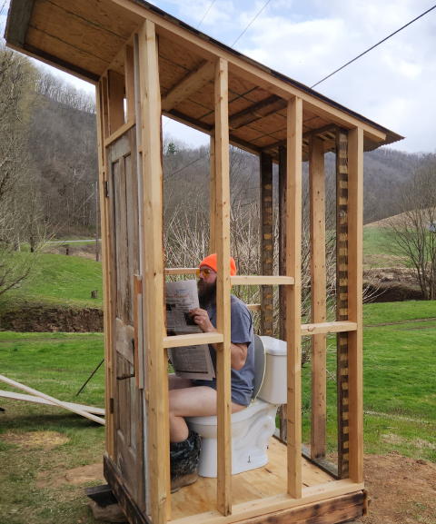 Friend gives the outhouse a trial run, reading the Calhoun Chronicle By Bob Weaver 2023 Over the years I have photographed lots of outhouses, mostly in Calhoun, including a two-story outhouse on Rowels Run. This week was a first, an under construction outhouse with a modern commode, flushing water, connected to a septic tank, actually a temporary construction while the house's bathroom is being renovated. Jason Firestine and his wife, who purchased the historic Roach cabin along the lower West Fork and continue with its restoration, have managed to stick to the classic outhouse look. Firestine's friend gave the unfinished outhouse a chilly trial run. |