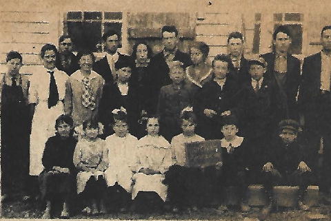 The original family attended the Slab Fork one [The photo above and below text is a newspaper clipping, the date is unknown] Lina Barr of White Pine has saved this picture dated Nov. 13, 1913, showing students at the Slab school. The school was located on Laurel Creek on what was known as the Billy Ayers bottom, near the old residence of the late John F. Ferguson. The location now belongs to the Barr family of White Pine. Mrs. Barr was also able to name all those in the picture. First row, left to right: Cleo Gainer. Susie Grimm Wilt, Hollene Wease, Lina Kelley Barr. Violet Grimm Roberts, Jack Ferguson and Virgil Kelley: second row: Playford Wease, Rene Grimm White, Eula Ferguson, Carl Gainer, John Wease, Noel Grimm, Rome Ferguson; back row: Lem Kelley, Willie Ayers, teacher Pearl Smith, Harley Grimm, Edna Ferguson Swanson, Burl Gainer, Doyle Gainer and Victor Gainer.