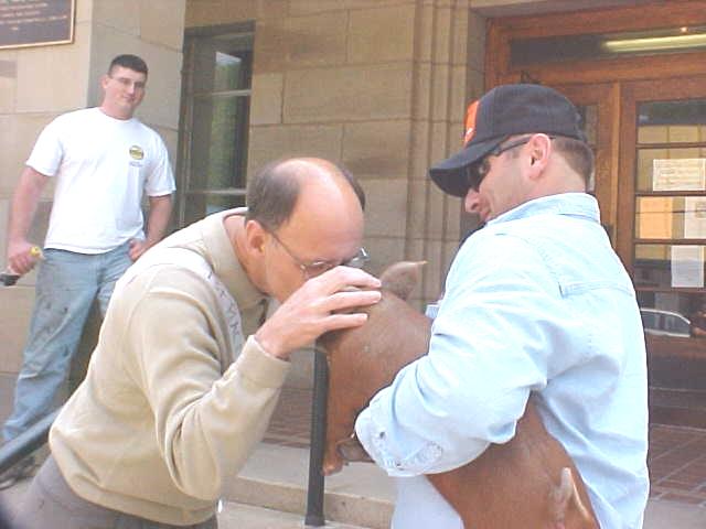 ![]() Banker Jim Bennett was a 2-to-1 choice for the honors to kiss the pig, a Relay for Life Fundraiser. Bennett said "Beauty is in the eye of the beholder." A small but exuberant group cheered Bennett as the pig squealed loudly. At one local "Kiss the Goat" contests a while back, after a local pastor kissed the goat, it died. (Not right away)