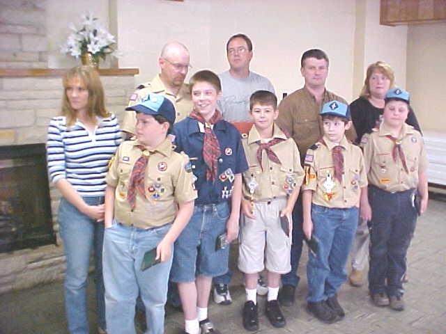 ![]() Webelos II with parents who are now eligible to become Boy Scouts (L to R) Clinton Bush, Zach Moore, Justin Gerwig, Eli Dye and Ben Sims