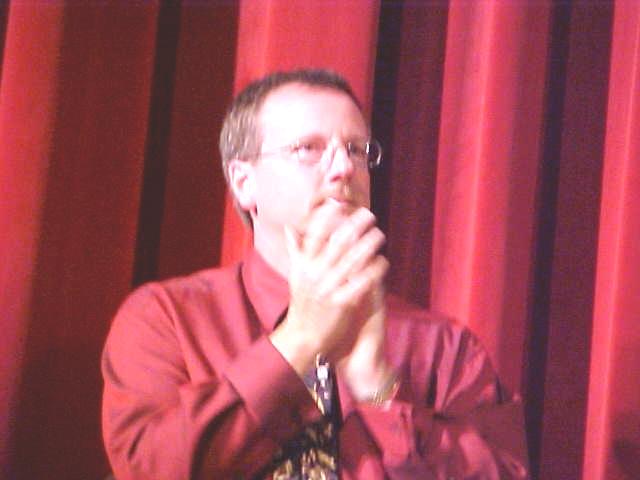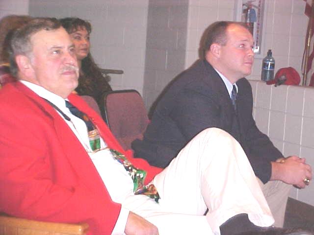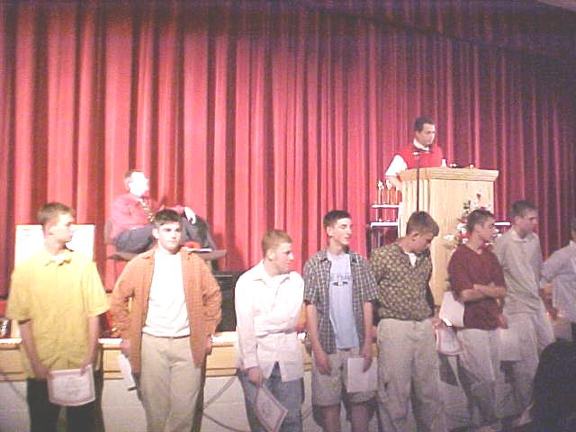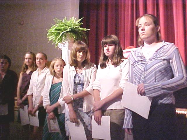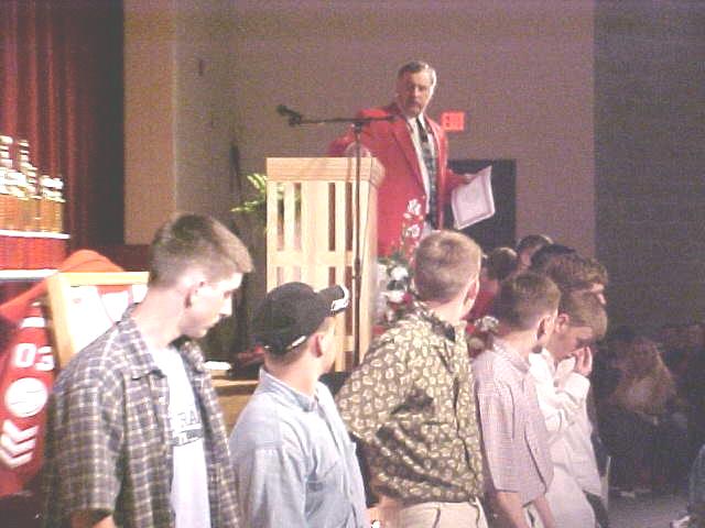 Coach Tim Davis hands out awards for basketball The annual Calhoun High School All-Sports Banquet, sponsored by the Athletic Boosters, recognized CHS students for their contributions to 2002-03 athletics. Bob Bailey (Class of '77) served as Master of Ceremonies for the event which was held Friday evening. Parents, coaches and athletes enjoyed a banquet dinner prior to the awards ceremony. Bailey spoke to the audience about his long-time interest in sports and being grateful for the opportunity of being at the awards banquet. Former CHS graduate of 1992 Brian Stump was the guest speaker for the event. Stump spoke to the athletes about setting goals, saying "You and only you can determine the destiny of your life." He said his high school and college career playing sports was an "Awesome time." Kathy Conley told the group the Athletic Boosters had raised $25,000 to support CHS programs.