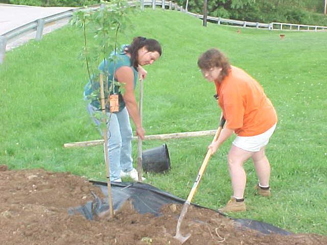 ![]() Susan Carpenter ensures a new maple tree will last for many years while Deb Mace and Tracy Lancaster shape the rest of the bed