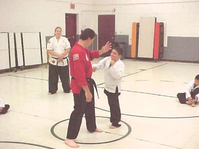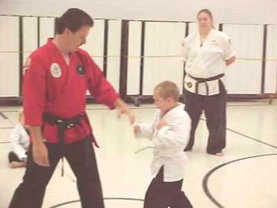 Nathan Cosgrove goes hand-to-hand with the black belt to pass the test