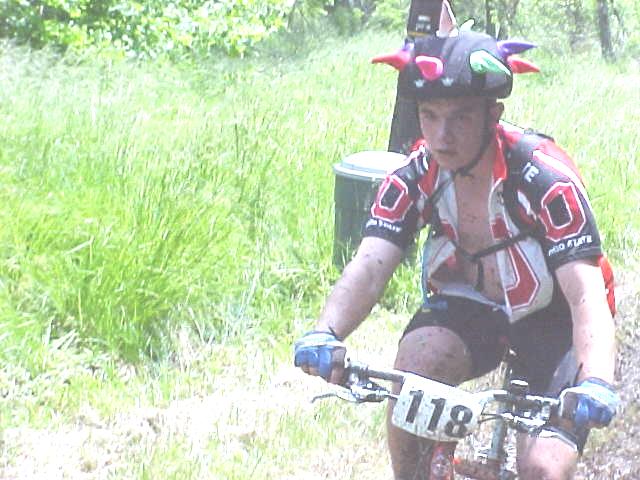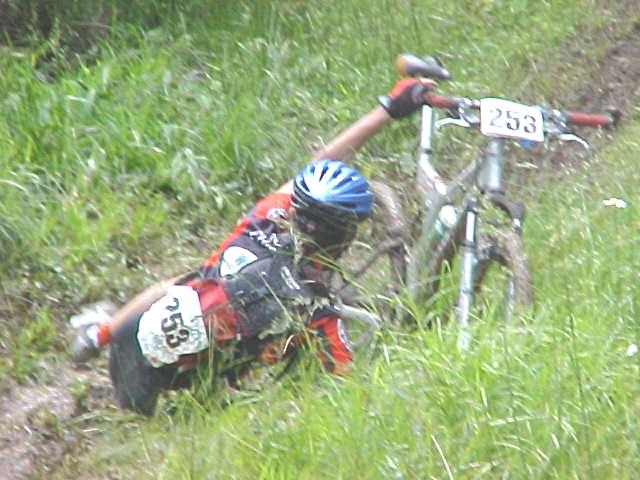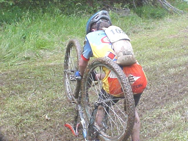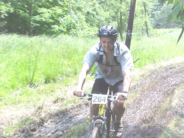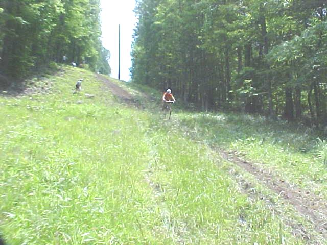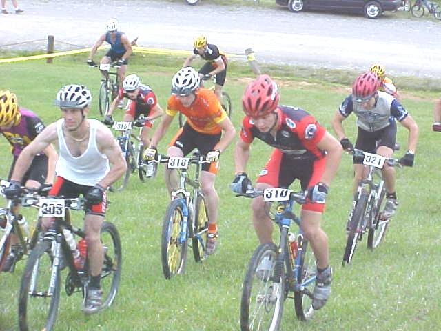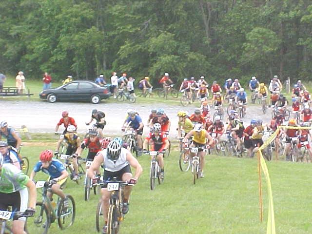 ... and up the hill they go starting 7.2 mile course The 7.2 mile Appalachian Bike Classic was blessed with clearing weather over the weekend, after heavy rainfall made the trails muddy. About 125 racers from West Virginia and the region participated in the seventh annual event. Three different classes of racers navigated the trail from one to three times, cheered on by spectators around the loop. This was the first year for bikers to pump across the Gene Vance Trail, which was dedicated last year in memory of the West Virginia soldier, who was an avid biking enthusiast and attendee of the Classic. Bikers went down slippery slides, splashed through mud holes and crashed in sloppy bogs, but mostly it was just hard work keeping upright on the rain-soaked trails. The "Power Slide" which descends to a bottom along Phillip's Run was highly greased, but few crashes occurred.