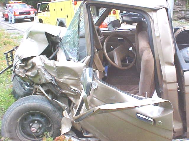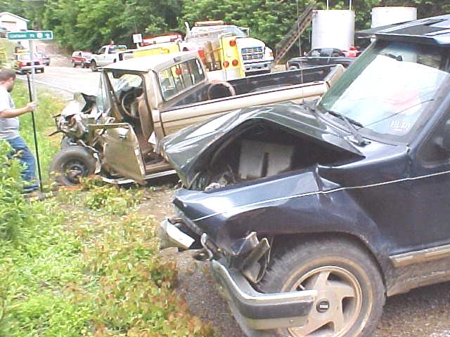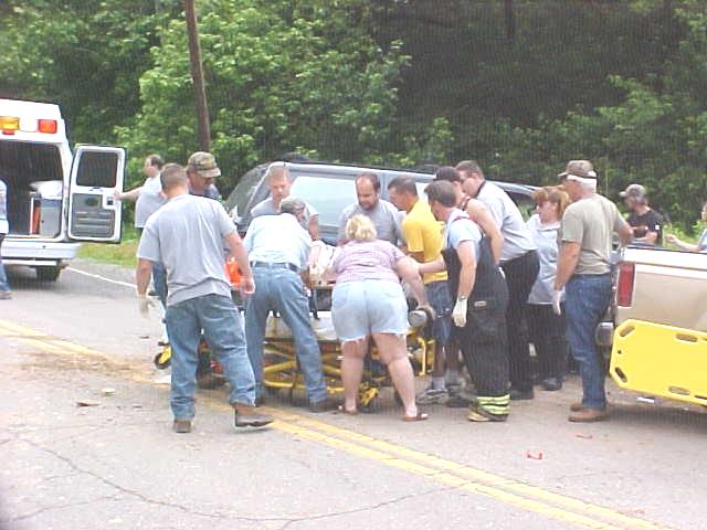 One of three accident victims being readied for transport A serious two-vehicle collision happened yesterday about 10:30 a.m. at the intersection of Leafbank Road and Route 5 just west of Grantsville. Duane Sampson of Big Bend received injuries when his 87' Ford truck collided with a '92 Ford Explorer. A report on his condition was unavailable. The steering wheel of Samson's vehicle was pushed into the driver's seat and the driver's door came open. Emergency workers extracted Sampson from the truck and he was taken to Minnie Hamilton Health Care Center. A passenger in Samson's truck, Jessica Riddle of Grantsville was taken to the hospital by Calhoun EMS. Also injured in the collision was Amanda Gail Williams of Big Bend, who was driving a '92 Ford Explorer. She was also taken to MHHCC.