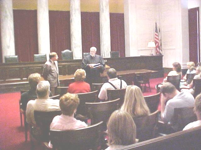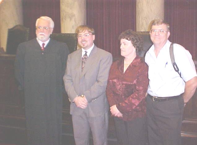 L to R - Justice Starcher, Matt Minney, mother Linda Minney, father Randy Minney Minney was honored by his co-workers and Justice Starcher at a reception, following the ceremony. He was appointed Prosecuting Attorney for Calhoun County this week by the county commission, filling the un-expired term of Tony Morgan. Minney is a native of Shock, Gilmer Country, and is currently employed by the West Virginia Supreme Court in Charleston, and was previously a law clerk with the 14th Judicial Circuit. He is a member of the West Virginia Bar, U.S. District Court for the Southern District of West Virginia and the Fourth Circuit Court of Appeals. Minney graduated first in his class at Glenville State College in 1996 with a degree in education, receiving a Doctor of Jurisprudence at West Virginia University in 2001, near the top of his class. Earlier he was a substitute teacher in Gilmer and Calhoun County. Minney said he is looking forward to becoming Calhoun's prosecutor. He will assume his duties on August 1st. Minney says one of his hobbies is amateur radio, and has written articles published in QST, 73 and Worldradio magazines. Longtime prosecutor Tony Morgan says he intends to devote his attention to his law practice in Grantsville. An appreciation dinner will be given Morgan on July 29th between 11:30 and 1 p.m. at the Courthouse, recognizing him for his many years of service to the county.