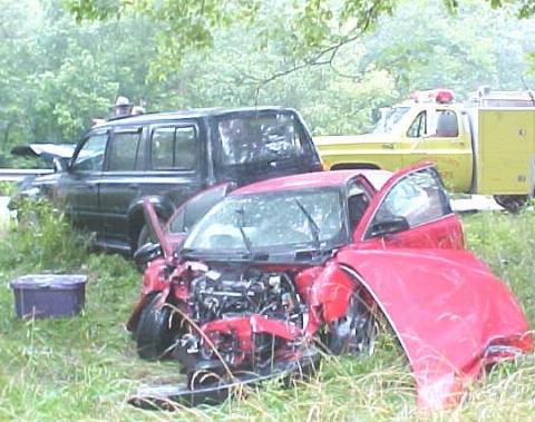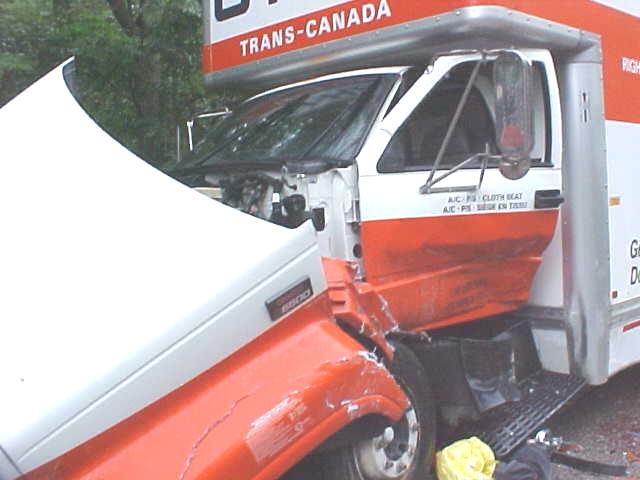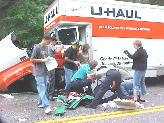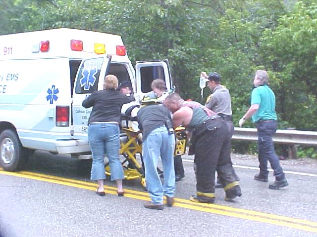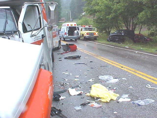 Three vehicles crashed on the Grantsville side of Hog Knob Hill shortly after noon yesterday, sending five or more people to Minnie Hamilton Health Care Center, some of them children. Virginia Harris, 28, was seriously injured after a Toyota van spun out of control on rain slick Hog Knob Hill and pinned her against a large U-Haul truck. She is the wife of Pastor Jeff Harris, 34, formerly of the New Testament Baptist Church at Big Springs. Harris was taken to Charleston Area Medical Center by their Critical Care mobile unit, after HealthNet was unable to land at Grantsville because of bad weather. Harris is reportedly suffering from trauma to the lower extremities. She is undergoing emergency surgery tonight. At least five people received some injury in the crash, two miles east of Grantsville on State Route 5. Deputy Sheriff Carl Ballengee said the highway was "very slippery," wreckage strung up and down the road. A red Pontiac Grand Am headed west and driven by Jamie Myers of Big Bend was the first vehicle that reportedly spun out of control, striking the U-Haul truck, which was traveling east. The U-Haul truck was driven by Pastor Jeff Harris. After going left of center and impacting the U-Haul, the Pontiac skidded across the highway and landed in a grassy field. Harris, who had a child in the U-Haul, exited the truck to check on occupants in the wrecked Myer's auto. Mrs. Harris, who was traveling behind the U-Haul with the rest of her family, exited and ran toward the U-Haul, at which time a second vehicle reportedly came down the rain slick hill, a Toyota van driven by Debbie Hartshorn of Mt. Zion. Harris was then struck and injured, according to the Calhoun County Sheriff's Department. Deputy Sheriff Charlie Richards said Mrs. Harris was excited because she saw smoke coming from the U-Haul truck, fearing for the safety of a child. She was attempting to console the child when she was struck, he said. The Hartshorn vehicle continued in a skid and went back across the highway, crashing against the wrecked Myer's vehicle. Hartshorn was treated and released last evening. A report on the other injured parties was not available, although sources said none of them appeared to be seriously injured other than Mrs. Harris. Sheriff Allen Parsons said both vehicles which struck the U-Haul "pretty much followed the same collision path." There have been several wrecks in this same spot, he reported. All the vehicles were severely damaged, some totaled.