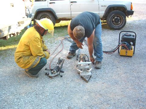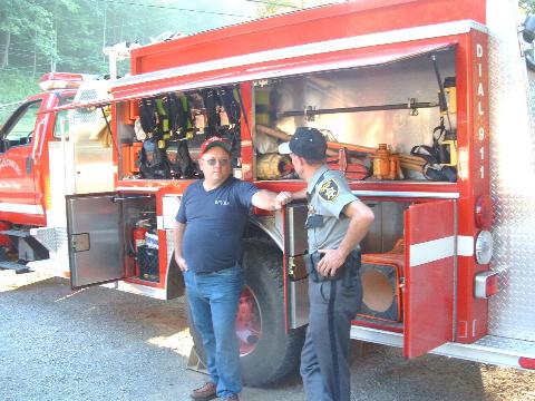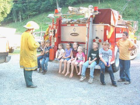 ![]() Officers and Firefighters from the Arnoldsburg Volunteer Fire Department arrived at the Leatherbark Community Church at Leatherbark Friday evening, July 18, with two trucks to demonstrate how they make real life "rescues." The church had completed a five-day vacation bible school, which followed the theme of "Jesus To The Rescue." Fire Chief Fred Waybright and Firefighters Carl Marks and Derek Wright explained the many aspects of rescue and fire fighting to the kids and took equipment from the trucks for them to see and handle. They were especially interested in the demonstration of the "Jaws of Life" and the many things the firefighters carry with them on the trucks. Also visiting the "rescue" demonstration was Deputy Sheriff Carl Ballengee in his Sheriff's Department Jeep. He talked with the group and allowed the kids to ask questions and look at his vehicle. He made special effort with Cory Carpenter who was very afraid of the trucks and the policeman. The Firemen and Deputy were treated to the evening's covered dish dinner.