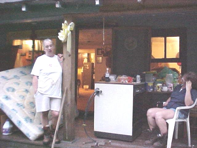 Helen Sampson was trying to clean-up with Water rushed out of McDonald Hollow into Sycamore Creek about 10:30 a.m. yesterday, causing flooding along a one mile stretch of the stream. Rising quickly, water went through the Gerald and Helen Sampson house, causing serious damage. The flood water was the highest residents could remember since 1985, carrying small buildings, bridges and debris down stream to lodge against a bridge above Tom Fox's residence. "Thank God for friends and neighbors helping," said Helen Sampson, who had to remove all the floor covering from her house. Water was at least 18" in the dwelling. "It floated the deep freeze, washer and dryer," she said. The Sampson bridge washed away, but was retrieved later in the day by friends. The family was trying to dry out the floors at 9 p.m. last night, so they could bring some furnishings back in the house. "It could have been worse, I guess," said Sampson, who has lived there since 1985.