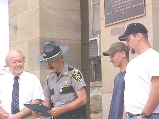 (Left-Right) Commission President Weaver, Three young men from Calhoun were recognized yesterday for their bravery in trying to rescue a a 16-year-old girl whose car plunged into the West Fork River. "James 'Aaron' Allison and Zeke Quick of Chloe made heroic efforts to save the life of Cindy Self last June 16th," said Chief Deputy Carl Ballengee. . Thomas Husk, who assisted the other teenagers, could not be present for the ceremony, but was given a Certificate of Honor earlier in the day. The ceremony was held in front of the Calhoun courthouse, and was attended by several family members. The awards were presented by Chief Deputy Sheriff Carl Ballengee and Commission President Bob Weaver. Chief Deputy Carl Ballengee said "This was a very tragic accident. I felt these men needed to be recognized for the efforts they exhibited." Calhoun Commission president Bob Weaver said "It speaks well for these young men, and the actions they took that day. It is important to our community to recognize them today." Sheriff Allen Parsons said their actions reminded him of the scripture, "Greater love hath no man than this, that a man lay down his life for his friends."