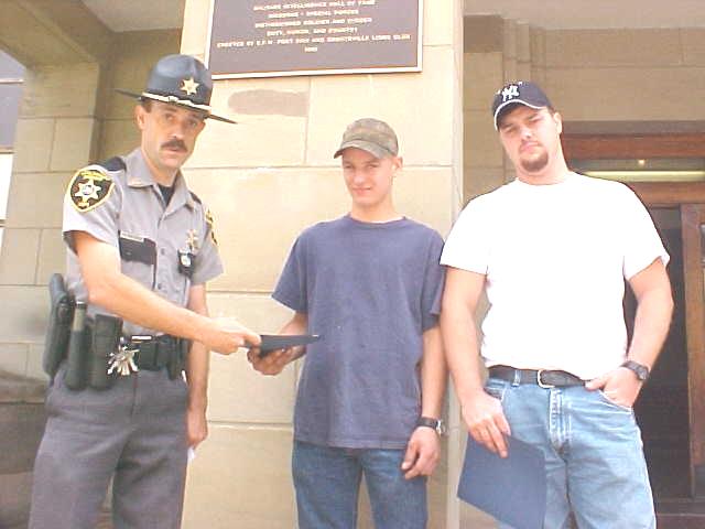 ![]() Zeke Quick (left) Aaron Allison (right), not shown Thomas Husk Deputy Ballengee said "Shortly after 5 p.m. on June 16th, Calhoun EMS, the Arnoldsburg Fire Department and the Calhoun Sheriff's Department responded to Altizer Road where a car was in the river on its top." Ballengee said Zeke Quick and Aaron Allison saw the accident happen. Quick took immediate action, getting out of his truck and jumping in the West Fork to try and rescue the girl. Allison drove to a nearby residence to call 911. Allison returned to the scene where Quick and Thomas Husk were trying to get Cindy Self out of the vehicle, which was covered by water. Allison hooked a chain to the submerged auto and then all three removed Self from the swollen river. Quick started CPR on the victim, until Calhoun EMS arrived on the scene. Unfortunately, Cindy Self could not be resuscitated. See article on tragedy NEWS ARCHIVES June 16, 2003.