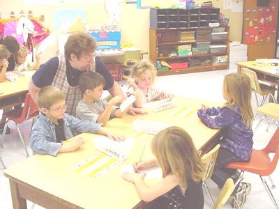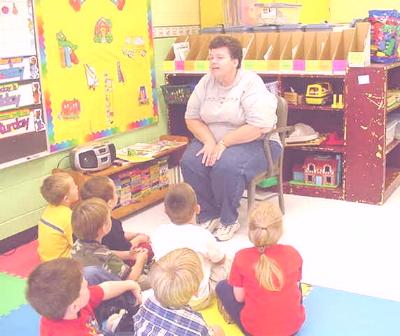 | Submitted by Larry Stinn The kindergarten teachers and para-professionals are team teaching in the mornings this year at Pleasant Hill School. The students go to all five learning stations for a 20-minute lesson on different kindergarten objectives. Mrs. Becky Czap teaches each group awareness of the sounds that make up language. This is a foundation which must be in place to learn phonics. Later in the year she will introduce them to phonics, the relationship between letters and sounds.