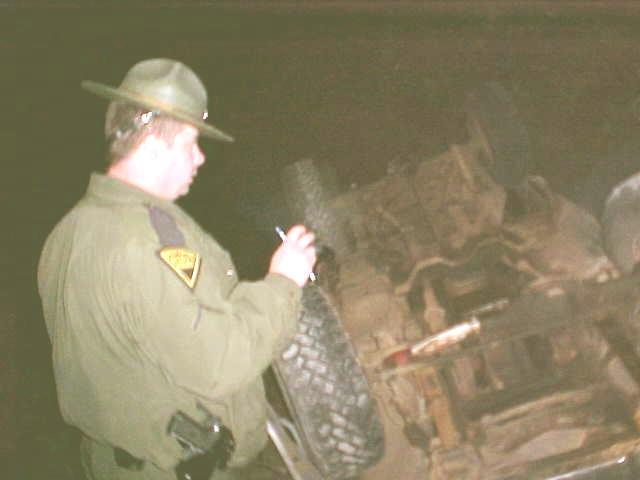 Trooper Jeff Hunt Investigates accident on foggy Liberty Hill A Chevy pick-up truck rolled over Saturday night on Liberty Hill, U. S. 33-119, west of Arnoldsburg, the driver escaping injury. Sources at the scene indicated the driver was being processed for possible DUI, with State Trooper Jeff Hunt investigating the accident. The truck appeared to be traveling east on the Arnoldsburg side of the hill, when it went out of control and landed in the ditch line. Calhoun EMS and the Arnoldsburg VFD responded at 10 p.m.