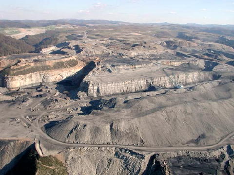 ![]() A massive drag-line, dwarfed by the huge scale of the operation, at work on a mountaintop removal operation near Kayford Mountain, WV Photo by Vivian Stockman, Oct. 19, 2003