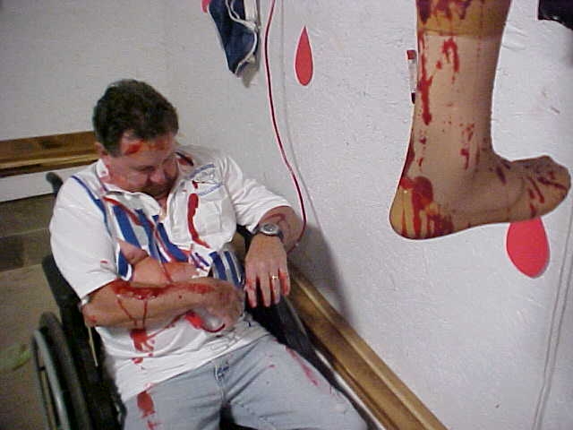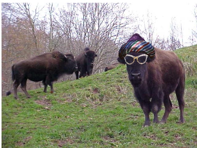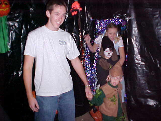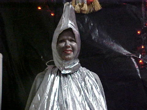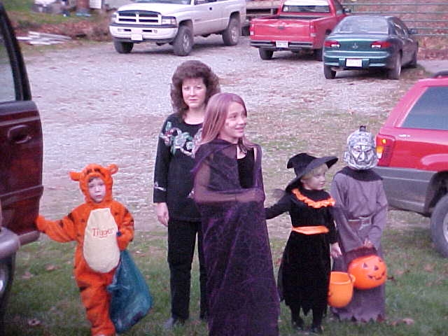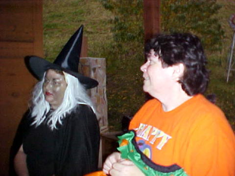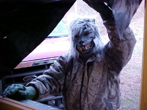 At first the reporter thought this was Jack Marks dressed as a buffalo, By Bob Weaver 2003 It's always a Halloween hoot at the Jack Mark's residence at Arnoldsburg, with the Marks family, relatives, friends and neighbors coming up with something new and exciting every year. Janet Marks said it was hard to surpass the year that Jack dug a "grave" in the front yard, covered himself with some fake grass, and "rose from the grave" for trick or treaters. This year hundreds of kids and adults visited the "Haunted Garage," which had six rooms of thrills and terror. Even the Marks family buffalo behind the house seemed to be part of the act.