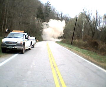 Wirt DOH workers use dynamite to remove rock Photos by Bill Ward Wirt DOH workers spent 12 hours Saturday removing a giant rock that slid from a steep hillside above State Route 5 at Burning Springs. The highway was blocked for several hours. An early call to 911 expressed fear an auto had been crushed under the rock, which was not an accurate report. A vehicle did run into the boulder after it fell in the highway early Saturday morning. Workers used dynamite and a hydraulic ram to break the rock into smaller chunks, according to road supervisor Alvin Engelke. Work is expected to continue today to make repairs to the roadway, including a hole knocked through the blacktop.