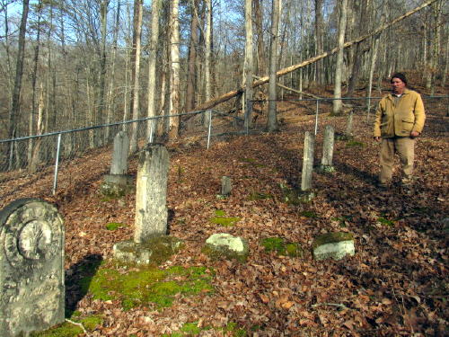 Gilmer County historian William Ostat explores cemetery Davis describes one incident near the plantation where "soldiers" showed up and demanded to know the hiding place of the horses, while all the men were away. Mrs. Stalnaker would not tell them and they threatened to kill the youngest child. She still would not tell. They took the babe in arms from the woman and placed it in the road, then riding their horses, jumping over it. They rode away, the child unharmed. Davis said he wrote about a scenic spot near the plantation called "Natural Rock Garden" in an article he wrote in the 1930s called "Have You Even Been To DeKalb?" written in the West Virginia Journal. He said the "Tree of Heaven" (Ailanthus grandulosa) was introduced from Virginia to the Stalnaker plantation, still a controversial tree. Members of the Stalnaker clan are buried in a hillside cemetery close to the plantation, likely with a number of slaves associated with the family. Here in the 21st Century, walking across the Little Kanawha River, Grass Run and Millseat Run, it is almost impossible to visualize the busy plantation from 200 years ago. An Indian grave near DeKalb is on a high ridge on the right of Holt's Run. It is near the end of the ridge, about one-half mile from Route 35. The Stalnaker family has continued to proliferate in Gilmer and its regional counties. |