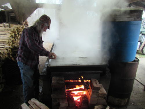 The final Maple Syrup treasure Bob Weaver 2023 Ralph Carpenter lives in the deep wilds of Jakes Fork, off US 33/119 at Letherbark. He is not a back-to-lander, never leaving his deep roots in the Calhoun woods. This week he was sap'in maple syrup, he and his helpers boiling the sap down in wood-heated stirring pans. Currently it takes about 55 gallon of sap to make one gallon of maple syrup. Carpenter is among the last standing "people of place" in the Calhoun woods from his generation, digging deep into the sod to collect its bounty, also having an immense collection of artifacts from years gone by.