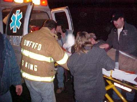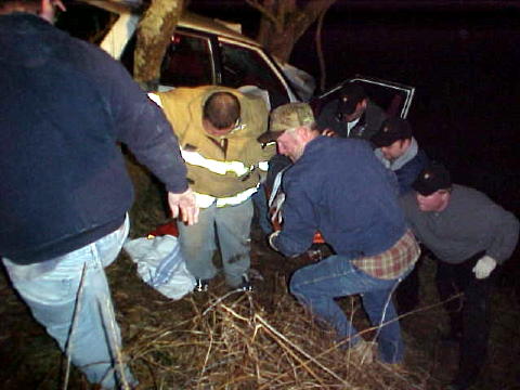 Emergency personnel bring victim up embankment after he is extracted A driver was trapped in his vehicle early Wednesday morning after it went out of control on Euclid-Nicut Road, striking a tree head-on and almost plummeting into the freezing waters of a nearby stream. Upper West Fork firemen and Calhoun EMS personnel worked for nearly an hour extracting a 25-year-old Shock, WV man from the wreckage. Josh Cottrill, who has been living on Frozen Run with his grandfather, reportedly received injuries to his head and other trauma. He was airlifted by HealthNet from the Upper West Fork Park about 2 a.m. to Charleston Area Medical Center. A passerby discovered the wrecked auto with Cottrill trapped inside shortly before 1 am. Neighbors said they believed the accident might have happened about 11:30 pm. Sheriff Allen Parsons and Chief Deputy Carl Ballengee investigated the accident. Calhoun EMS dispatched two ambulances and the Upper West Fork VFD dispatched units to the scene, four miles from State Route 16.