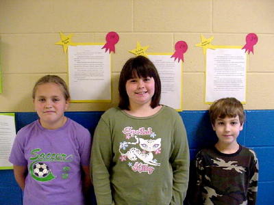| Submitted by Larry Stinn February is Young Writers Month throughout West Virginia. In addition to instruction focusing on the steps of the writing process, there is a writing contest. The Pleasant Hill School winners are 3rd-4th Grade: "Fishing with Dad" by Hannah Peck, "The Giant Elephant" by Rochelle Gerwig, and "The Brown, Dusty Trail" by Devon Toppings 1st-2nd Grade: "Stinky Pete's Bad Day," by Blake Hughes, "My Camping Trip" by Joseph Richards, and "The Greedy Rooster," by Ryan Slider
