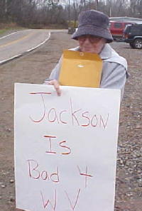 "God forbid if he is elected governor," she said. Jackson, a millionaire oil and gas businessman and former state senator, frequently refers to his rural county, but in fact lives in Charleston. Jackson's reputation in Democrat ridden Lincoln County has gone down hill after a Republican write-in candidate defeated him for State Senate. He still managed to be elected by voters in the senatorial district. Carol Smith, president of the Lincoln County school board, said the system has been held hostage by Jackson's followers, allowing community schools to fall apart. Lincoln County resident Thomas Ramey said "Beware Calhoun! Lloyd Jackson tries to portray his Lincoln home boy roots, when in fact his political and business ambitions have created a gap that seems beyond repair." "He is the state's chief architect for school consolidation, closing community schools and causing two-hour bus rides in our county, when that movement has been discontinued around America." "With student population falling in Calhoun, it will likely happen that your last elementary schools in Arnoldsburg and Pleasant Hill will be moved to the consolidated Mt. Zion School," said Ramey. Protester Karen Sargent said "I don't want to see Jackson continue to do to West Virginia what he has done to Lincoln County," referring to the closure of nearly all the schools with the building of the most costly high school ever built in the state at $30 million. "Hey, the only entrance road to the new school even floods, but that's the way things work down here," she said. "In the Lincoln County community of Harts you must now go to school in Logan County, or get permission from the school board to attend school in your own county. It is the final takeover of local education," she said. "I have a right to protest," said Elisabeth Sargent, a 16 year-old former Lincoln County student. Ms. Sargent commented on the apparent dissatisfaction of some of the rally attendees. "I was taken aback by one man's words after I asked for a chair for Mrs. Ramey." She said, "Mr. Jackson has avoided us on numerous occasions, I find it ironic that a man who wants to lead the state, doesn't want to face his opposition."