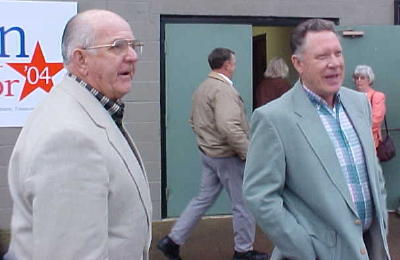 ![]() Oil and gas businessman Ted Adkins (left) heckled a member of the group, and Carl Cox, an apparent Jackson supporter (right), after a request was made for a chair for an elderly protester who had open heart surgery, said "I don't give a d- - -! So what if shes' had surgery. She should have stayed at home," and then saying "I have a right to say whatever I want to" about the elderly woman. The protesters then traveled to Spencer where they anticipated Jackson would make an appearance at a Democratic fundraiser being held at the community building. School board president Smith said Mayor Terry Williams became outraged, calling the group "idiots" and telling them to "go back to Lincoln County from where you come." Although the protesters remained outside on public property, a member of the mayor's group reportedly called the Roane County prosecuting attorney who advised them the group had a right to peacefully protest. "His behavior was not becoming of an elected official," said Smith. |