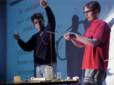Matt Kirby and student extract newly made polymer from a jar