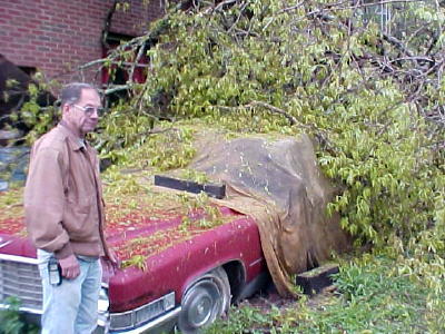 Vere Brannon inspects his old Caddy A giant oak tree uprooted early Monday morning and seriously damaged an Arnoldsburg florist shop. A roof and at least two walls collapsed at the Master's Bouquet, located along U.S. 33-119. Vere Brannon, whose wife Susie operates the shop, said the tree fell around 4:30 a.m., not only damaging the building and contents, but two antique cars. Brannon said his 1956 Chevy may be seriously damaged, but it was still under a lot of debris. The top on a 1969 Caddy sitting next to the building was also damaged. Neighbor Clyde Knotts said he heard the collapse before he got into his school bus for the morning run, but discounted it as a loud vehicle going down the road. Wind and rain dominated the area during the night, likely loosening the roots of the huge tree. Susie Brannon said the main part of the flower shop received some damage, but not enough to close the business. Estimates of the damage have yet to be made.