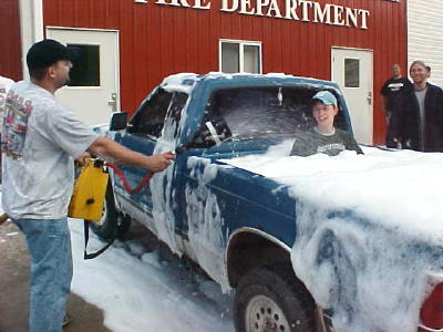 ![]() Fireman Ryan Bremar enjoys a "foam bath" generated by Craig Gherke